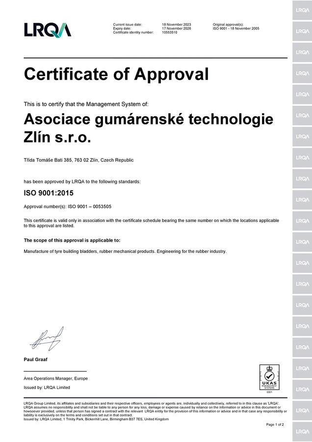 ASOCIACE GUMARENSKE TECHNOLOGIE ZLIN s.r.o., having company registration number (IC) 60749555, was established on 14th April 1995 by a group of rubber and tyre specialists who had previously been engaged in research, development and manufacture both in the Czech republic and abroad.
